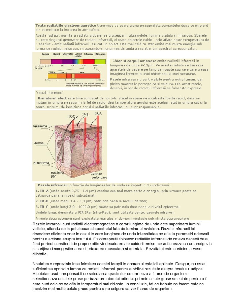 Razele Infrarosii Source from : https://ro.scribd.com/doc/258302255/RAZELE-INFRAROSII Vești bune pentru femeile care, după mesele copioase de sărbători, își doresc acum să slăbească. Din aceasta cauza cele mai multe tratamente din cabinetele de cosmetica. Tunelul cu raze infrarosii reprezinta o sauna profesionista moderna, cu multiple efecte benefice asupra organismului, tratand cu rezultate spectaculoase obezitatea, celulita, problemele de fermitate si de luminozitate ale pielii. Din ce tocmai am citit pe net efectul de degradare il obtii si daca fierbi excesiv. Astfel actioneaza si asupra durerilor menstruale: